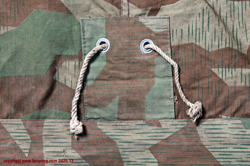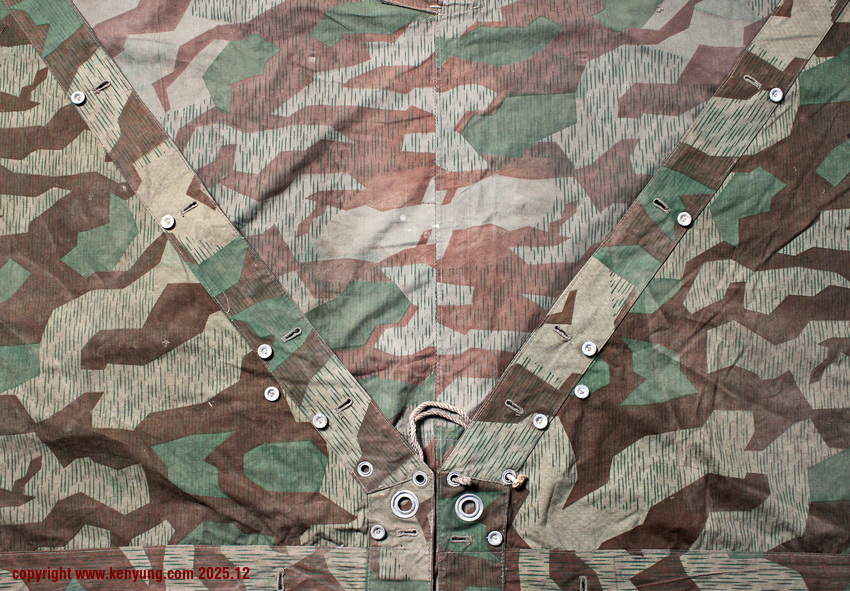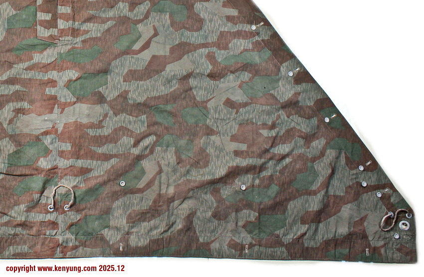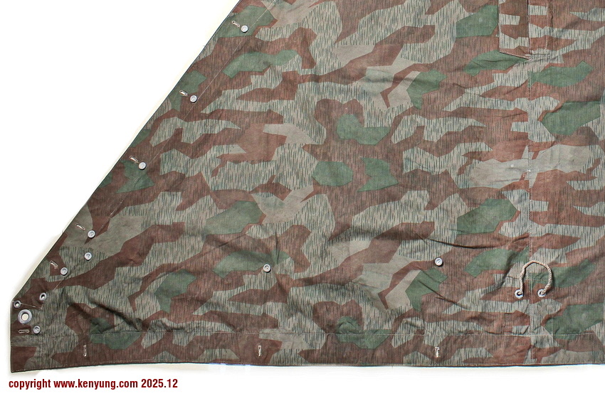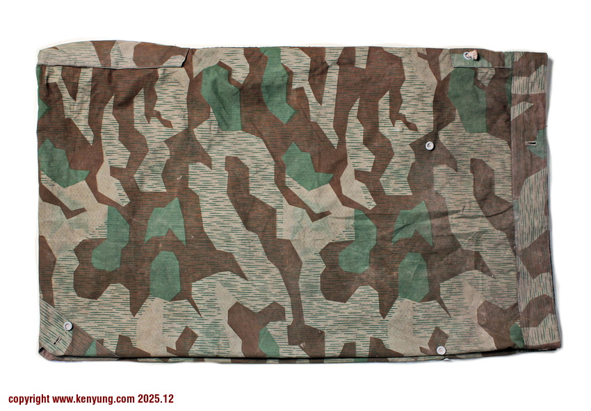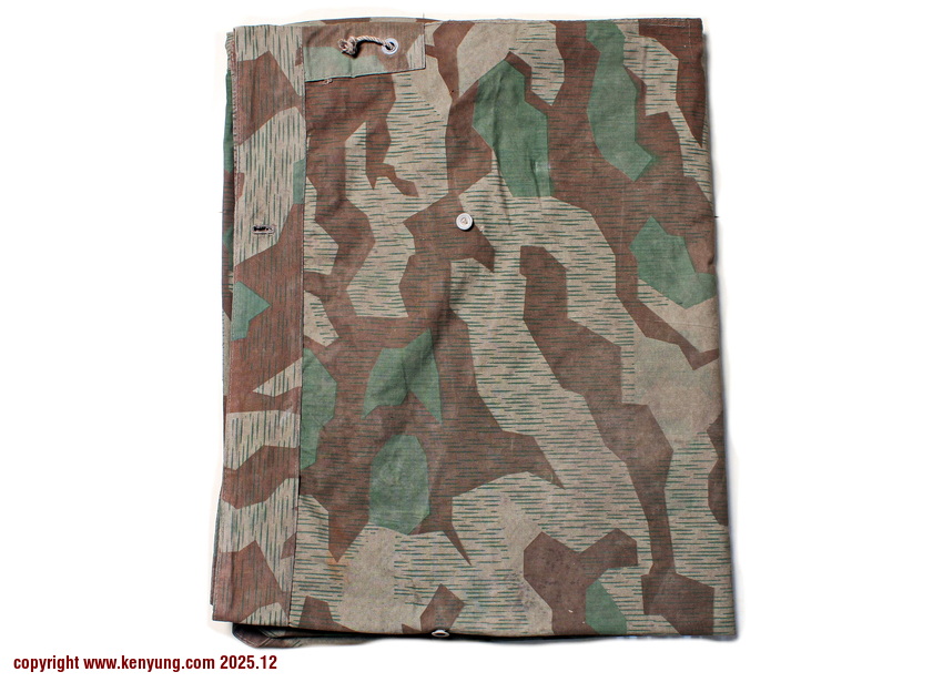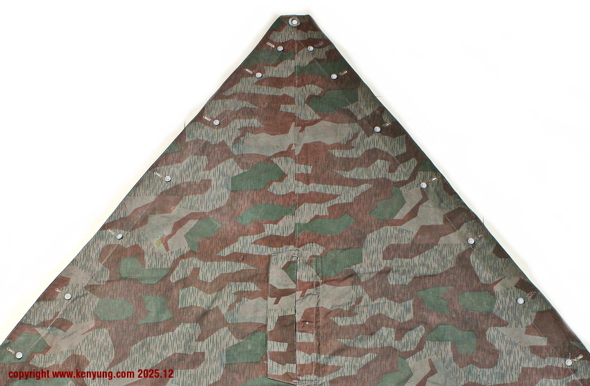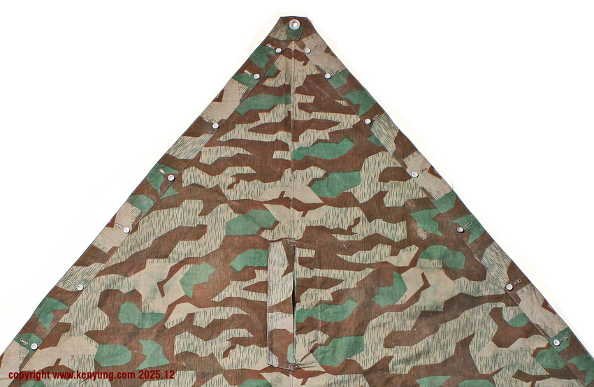 背景:帐篷布发展于1931年,采用一种被命名为Makostoff的防水棉布料制造,这种布料有着良好的防水性和透气性。与此同时,在布料的两面还分别染有不同的伪装图案:一面为秋冬迷彩图案;另一面为春夏迷彩图案。这就是M1931型帐篷布,也就是著名的防潮布。帐篷布为三角形,规格为250x203x203厘米,底边长度为250厘米。在三角形布料的两个窄边分别有两列12个锌、铝或铁制纽扣和12个扣眼,底边则有6个纽扣。这种三角形的帐篷布取代了方形灰色的帐篷布,作为一种主要的防潮和伪装装备广泛用于装备和人员的伪装。此外,使用不同数量的帐篷布可以组合成供相应人员使用的多人帐篷,如使用四块这种帐篷布就可以搭建一个可供四人使用的金字塔式帐篷。这种防潮布也可作为雨披和斗篷,可用于在骑马和自行车时穿着,还可以制作浮具,甚至还可以用来做为运送伤员的担架。帐篷布在携带时,通常内部卷着大衣或毛毯,卷成马蹄形固定在背包上。 这张照片展示的是按资料制作的一件防潮布复制品,右边的图解则向我们展示了帐篷布的各种使用方法:包括骑兵、山地与自行车部队。其他图解则是步兵将帐篷布用做雨披和斗篷的穿戴方法;搭建隐蔽所、半帐篷的方法:搭建4人帐篷的方法;搭建8人的帐篷的方法以及制作吊具和担架的方法等。