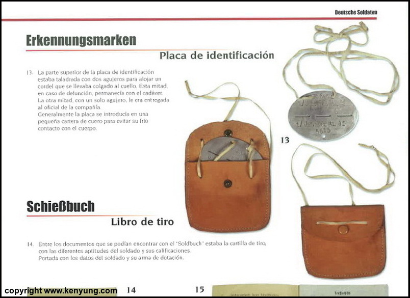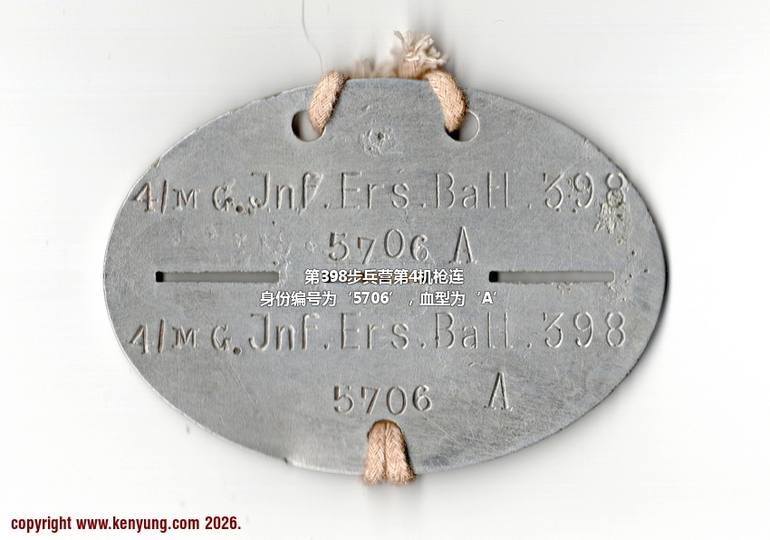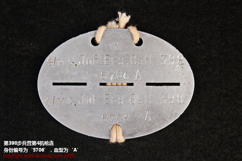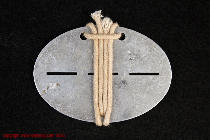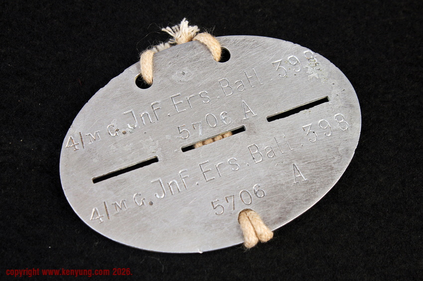 背景:对1866年普奥战争和1870-1871年普法战争中德意志普鲁士军队伤亡情况的评估显示,许多阵亡者无法辨认身份,这促使普鲁士军队于1878年引入了首批军人身份识别牌(狗牌)。最初的1878年式样狗牌一直使用到1915年7月,当时引入了第二种更大尺寸、包含更多信息的式样。1918年,一种略有改进的狗牌被引入,并一直使用到二战。1939年8月德意志国防军动员时,所有人员均被配发身份识别牌,需用绳索系于颈部佩戴。二战爆发后,所有新兵在原部队登记服役时均会配发狗牌。若阵亡或受伤,狗牌的一半将留在个人身上,另一半则会被送往相应的行政部门进行处理。值得注意的是:狗牌由新兵的原部队配发。单位,通常指训练单位,拥有特定的、指定的个人编号和单位番号,且根据规定,新兵在服役期间即使调换单位,也必须继续使用最初的识别牌,直至最终退役。唯一的例外是,若识别牌丢失,将由该人员当前服役的单位补发新的识别牌,上面会标注新的个人编号和当前的单位番号。最初,大多数识别牌是由铝,但后来,由于铝被用于其他重要的物品(大约在1941年底至1942年初),锌制身份牌开始大量发放,而钢制身份牌则在1944年中期左右少量发放。陆军部队必须备有备用身份牌,以便在需要时更换丢失的身份牌,通常部队会获得编制人员约20%的备用身份牌。关于在身份牌上添加血型刻印的规定似乎在1942年底至1943年初才开始实施,尽管早期发放的身份牌上偶尔也能发现血型标记。