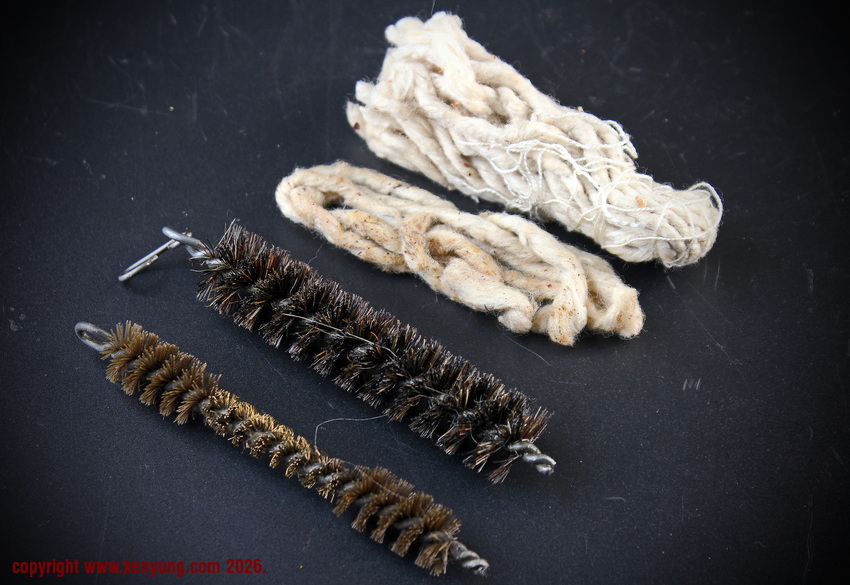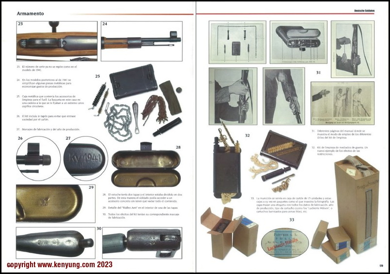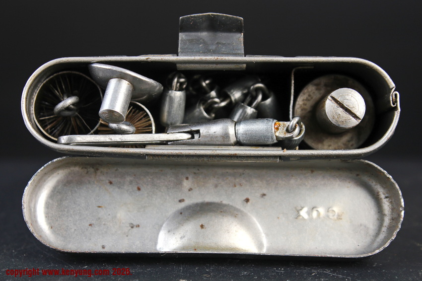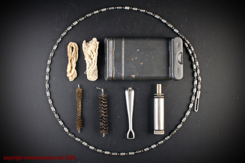 背景:K98在配发时,会附带各种附件,包括背带、清洁杆、护口套和M34清洁套件。M34清洁套件于1934年推出,适用于所有栓动步枪。