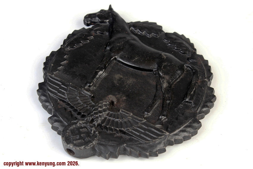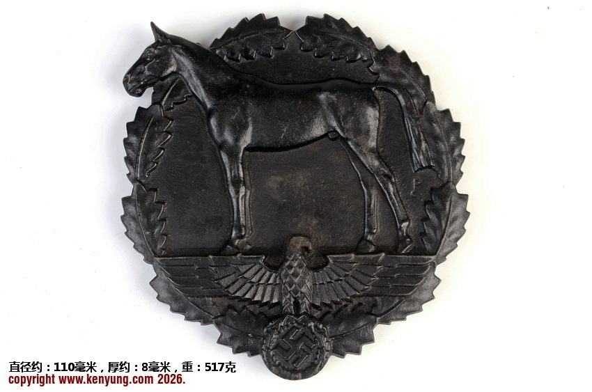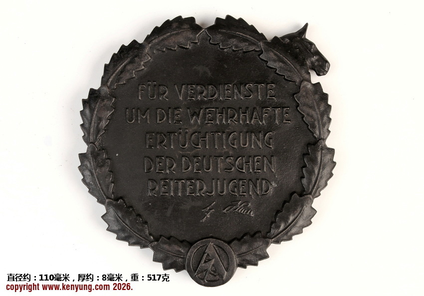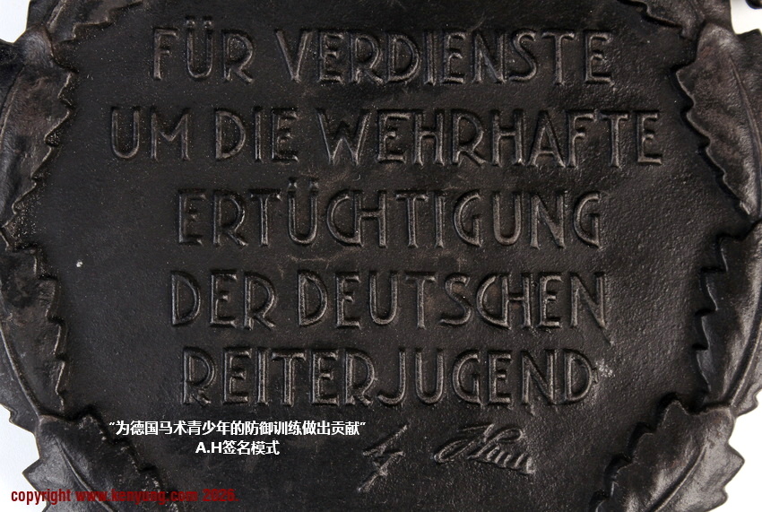 背景:该纪念牌由AH于1937年2月设立,旨在表彰那些为促进马术发展而捐赠马匹及相关物资的人士。纪念牌随附一份由“国家社会主义骑兵团”(Nationalsozialistische Reiterkorps,简称NSRK)团长签署的奖状,该团长同时担任SA-Obergrüppenführer。