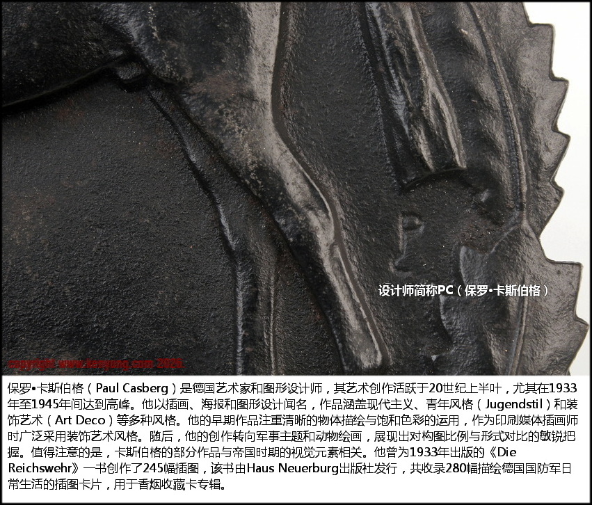 保罗·卡斯伯格(Paul Casberg)是德国艺术家和图形设计师,其艺术创作活跃于20世纪上半叶,尤其在1933年至1945年间达到高峰。他以插画、海报和图形设计闻名,作品涵盖现代主义、青年风格和装饰艺术等多种风格。他的早期作品注重清晰的物体描绘与饱和色彩的运用,作为印刷媒体插画师时广泛采用装饰艺术风格。随后,他的创作转向军事主题和动物绘画,展现出对构图比例与形式对比的敏锐把握。值得注意的是,卡斯伯格的部分作品与帝国时期的视觉元素相关。他曾为1933年出版的《Die Reichswehr》一书创作了245幅插图,该书由Haus Neuerburg出版社发行,共收录280幅描绘德国国防军日常生活的插图卡片,用于香烟收藏卡专辑。