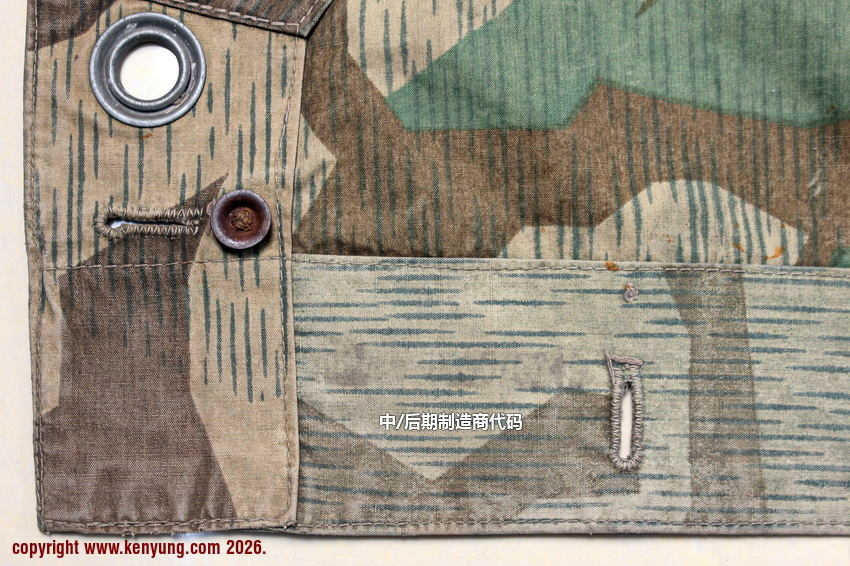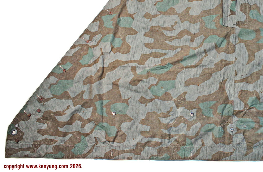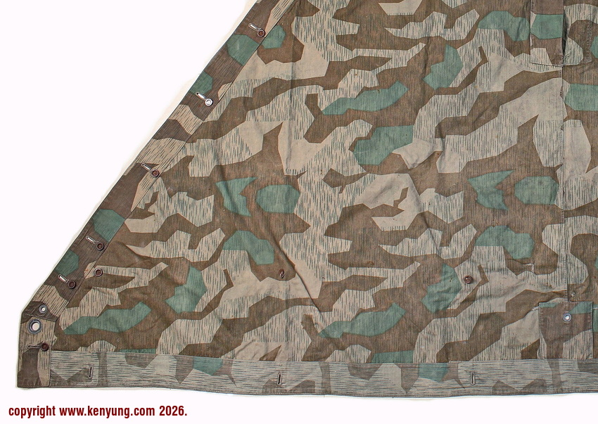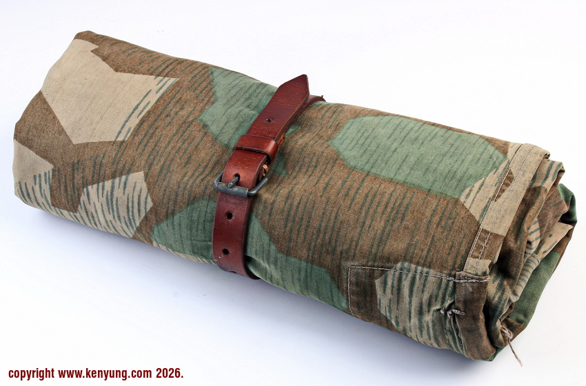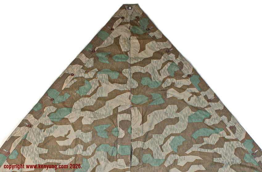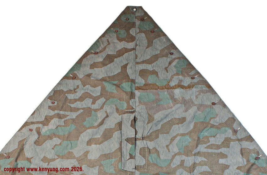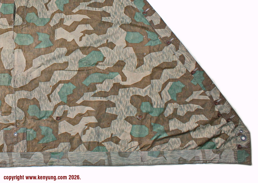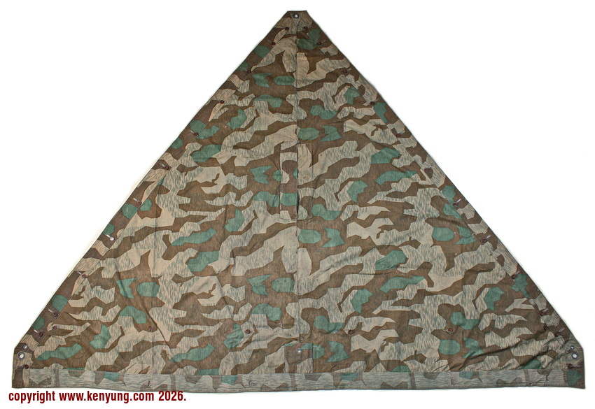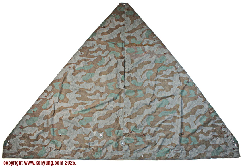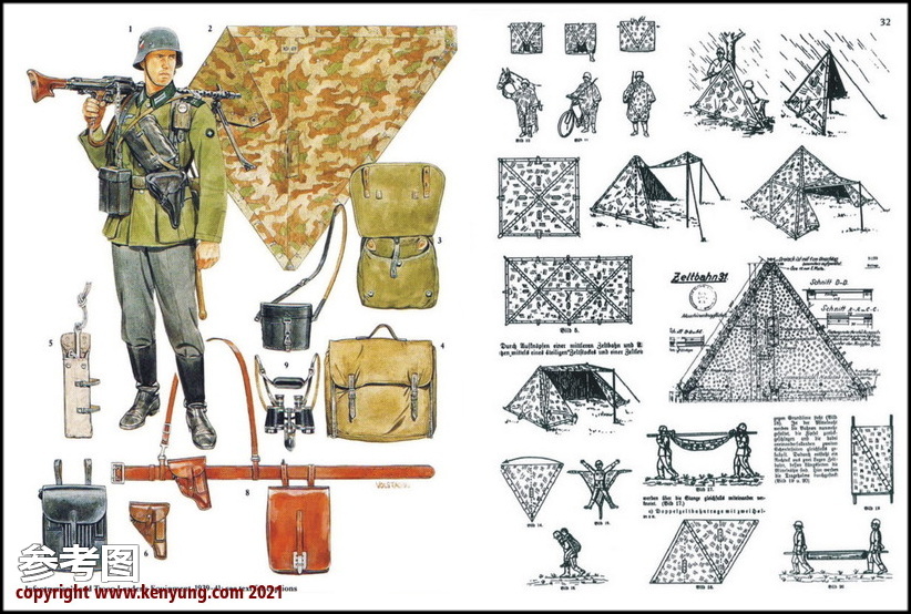 背景:帐篷布发展于1931年,采用一种被命名为Makostoff的防水棉布料制造,这种布料有着良好的防水性和透气性。与此同时,在布料的两面还分别染有不同的伪装图案:一面为秋冬迷彩图案;另一面为春夏迷彩图案。这就是M1931型帐篷布,也就是著名的防潮布。帐篷布为三角形,规格为250x203x203厘米,底边长度为250厘米。在三角形布料的两个窄边分别有两列12个锌、铝或铁制纽扣和12个扣眼,底边则有6个纽扣。这种三角形的帐篷布取代了方形灰色的帐篷布,作为一种主要的防潮和伪装装备广泛用于装备和人员的伪装。此外,使用不同数量的帐篷布可以组合成供相应人员使用的多人帐篷,如使用四块这种帐篷布就可以搭建一个可供四人使用的金字塔式帐篷。这种防潮布也可作为雨披和斗篷,可用于在骑马和自行车时穿着,还可以制作浮具,甚至还可以用来做为运送伤员的担架。帐篷布在携带时,通常内部卷着大衣或毛毯,卷成马蹄形固定在背包上。 这张照片展示的是按资料制作的一件防潮布复制品,右边的图解则向我们展示了帐篷布的各种使用方法:包括骑兵、山地与自行车部队。其他图解则是步兵将帐篷布用做雨披和斗篷的穿戴方法;搭建隐蔽所、半帐篷的方法:搭建4人帐篷的方法;搭建8人的帐篷的方法以及制作吊具和担架的方法等。