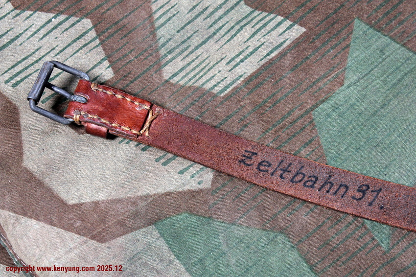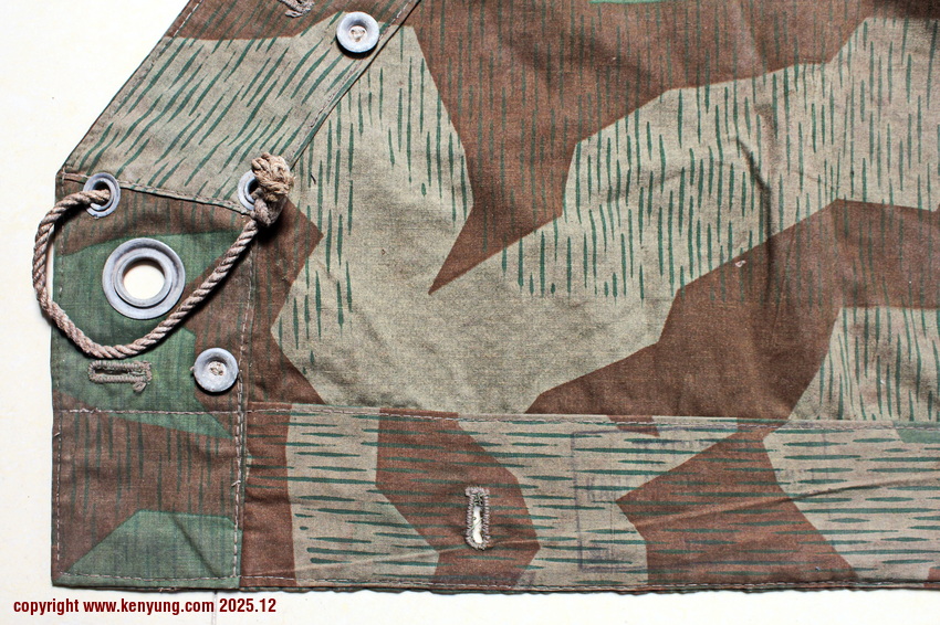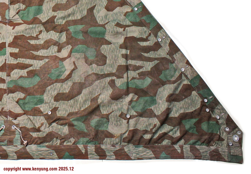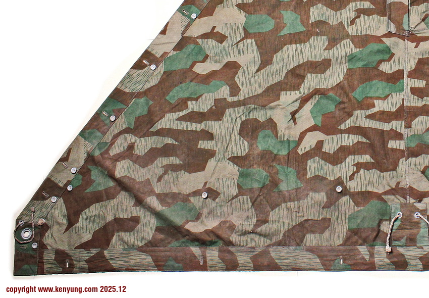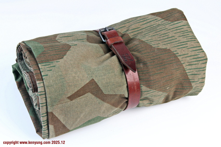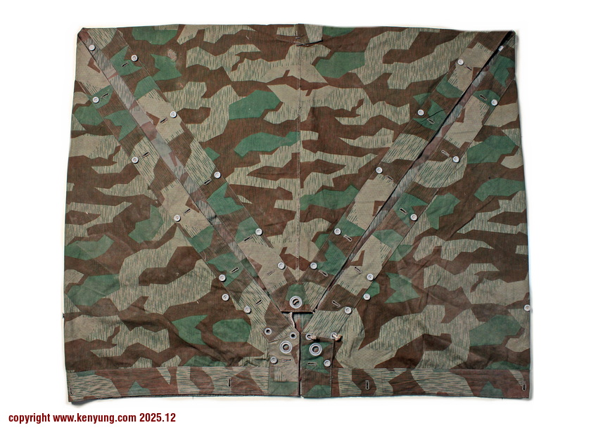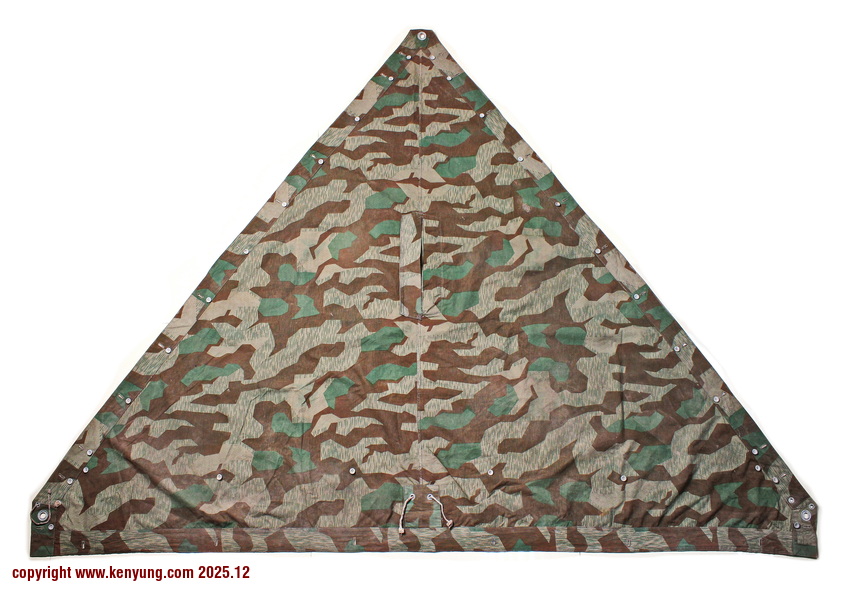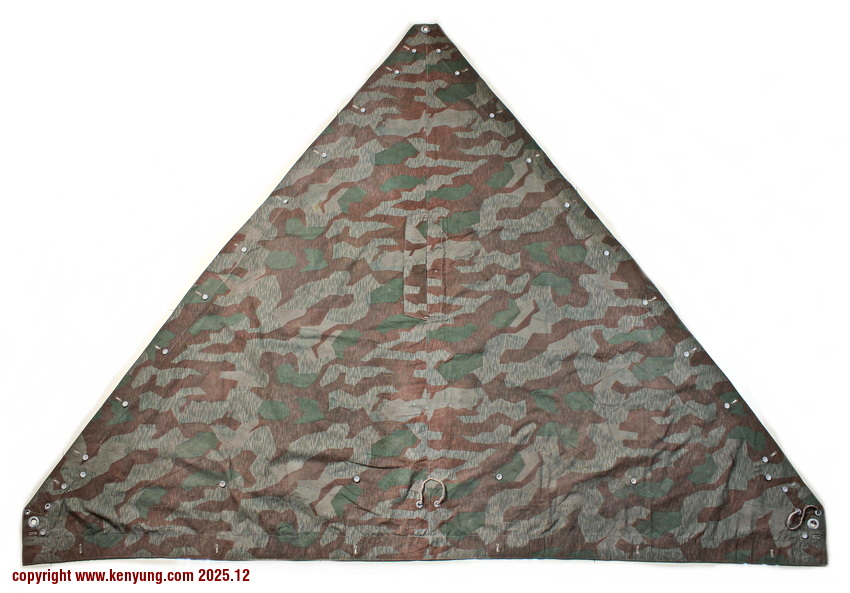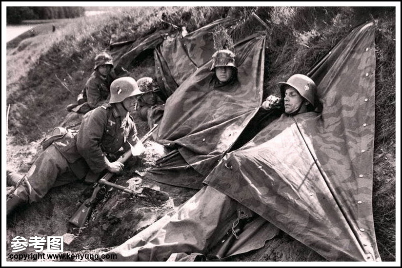 背景:帐篷布发展于1931年,采用一种被命名为Makostoff的防水棉布料制造,这种布料有着良好的防水性和透气性。与此同时,在布料的两面还分别染有不同的伪装图案:一面为秋冬迷彩图案;另一面为春夏迷彩图案。这就是M1931型帐篷布,也就是著名的防潮布。帐篷布为三角形,规格为250x203x203厘米,底边长度为250厘米。在三角形布料的两个窄边分别有两列12个锌、铝或铁制纽扣和12个扣眼,底边则有6个纽扣。这种三角形的帐篷布取代了方形灰色的帐篷布,作为一种主要的防潮和伪装装备广泛用于装备和人员的伪装。此外,使用不同数量的帐篷布可以组合成供相应人员使用的多人帐篷,如使用四块这种帐篷布就可以搭建一个可供四人使用的金字塔式帐篷。这种防潮布也可作为雨披和斗篷,可用于在骑马和自行车时穿着,还可以制作浮具,甚至还可以用来做为运送伤员的担架。帐篷布在携带时,通常内部卷着大衣或毛毯,卷成马蹄形固定在背包上。 这张照片展示的是按资料制作的一件防潮布复制品,右边的图解则向我们展示了帐篷布的各种使用方法:包括骑兵、山地与自行车部队。其他图解则是步兵将帐篷布用做雨披和斗篷的穿戴方法;搭建隐蔽所、半帐篷的方法:搭建4人帐篷的方法;搭建8人的帐篷的方法以及制作吊具和担架的方法等。